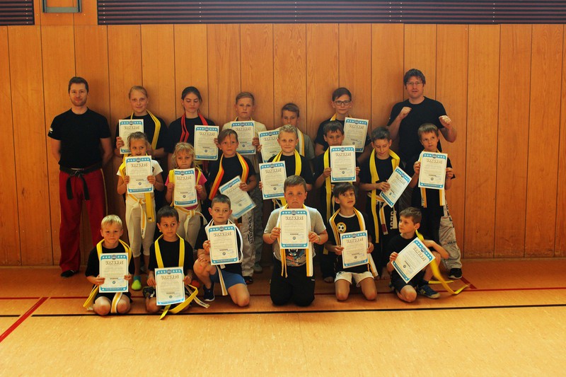 Als erstes waren die Bambinis an der Reihe. Hier legten insgesamt 8 Teilnehmer die Prüfung zu ihrem ersten Gürtel (weiß-gelb) ab. Nach Teils großer Aufregung konnten aber alle ihr